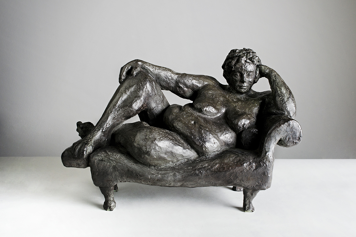 Een prachtig, imposant lijf op een chaise-longue gedrapeerd als een landschap.